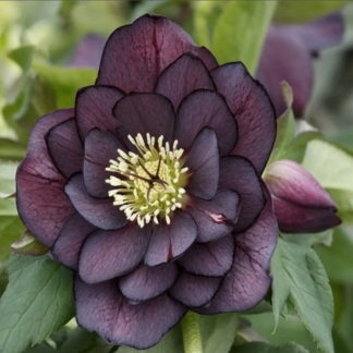 Морозник Дабл Эллен Пурпл – удивительный травянистый многолетник с мощным корневищем, пальчатыми кожистыми листьями и совершенно очаровательными цветками. У них нежные, будто вырезанные из тонкого пергамента, глянцевые лепестки темно-фиолетового цвета и золотисто-желтые тычинки.