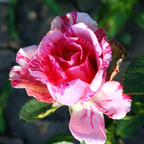Саженцы вырастают мощными, но достаточно компактными. Максимальный их диаметр равен 70 см, а высота – 110 см. Побеги прямые, ровные, с небольшим количеством шипов. Листья темно-зеленые, с блестящей поверхностью. Бутон бокаловидный, плотный, одиночный. Распускается он медленными темпами. Цветок диаметром 12 см, махровый. Лепестки слегка отгибаются наружу. Окрашены они неоднородно: на бледно-розовом фоне просматриваются малиновые или бордовые штрихи. Цветение пышное и продолжительное. Аромат легкий, приятный, с цитрусовыми нотками.